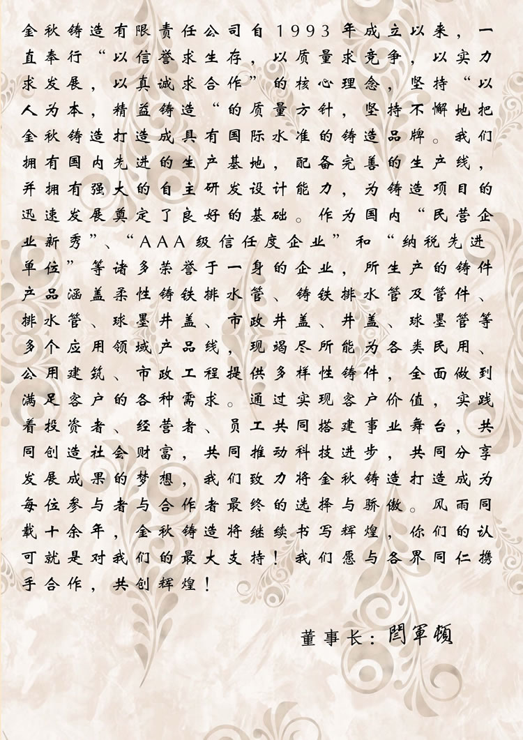 鑄鐵排水管是建筑管道和市政管道重要的組成部分,其最早出現(xiàn)于1644年的法國凡賽爾宮,距今已有三個多世紀(jì)的歷史仍承擔(dān)著重要排水功能。1993年金秋公司成立了一家以生產(chǎn)鑄鐵排水管為主的科技型企業(yè),至今已發(fā)展成為擁有員工近千人,市政鑄件分廠、鑄管廠、機(jī)械鑄件分廠、機(jī)加工分廠和鑄鐵冶煉廠多家分廠的鑄鐵排水管生產(chǎn)企業(yè)。公司擁有進(jìn)出口自營權(quán)產(chǎn)品足跡遍布全球,能夠按客戶技術(shù)要求生產(chǎn)各類鑄鐵排水管,擁有先進(jìn)的價格查詢系統(tǒng),能夠?qū)崟r提供全國各主要產(chǎn)地的鑄鐵排水管價格信息,是國內(nèi)規(guī)模較大的鑄鐵排水管廠家之一,竭誠歡迎廣大客商前來洽談業(yè)務(wù)。